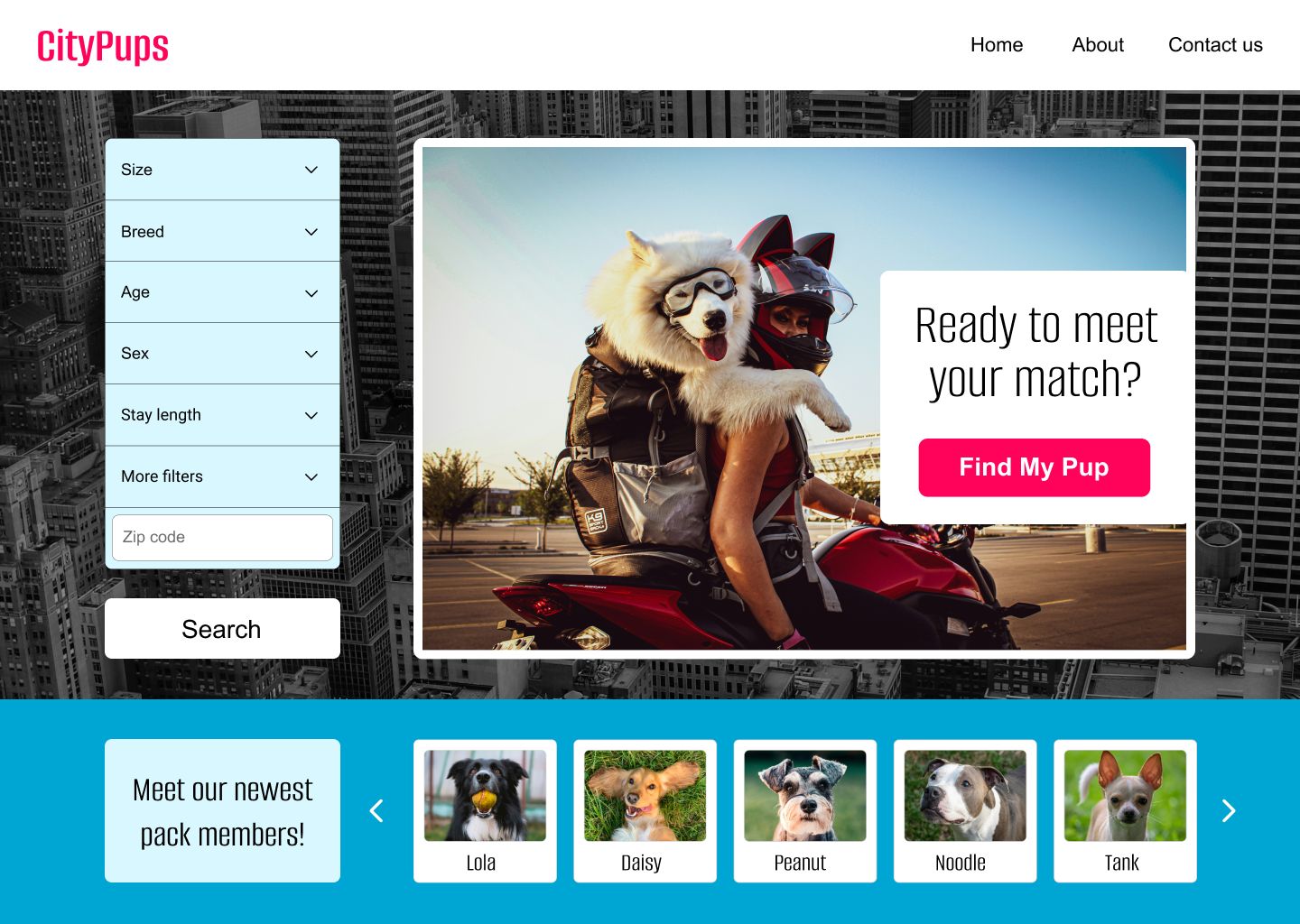 This project was completed as part of a modified GV design sprint. CityPups is a fictional company aiming to improve the online pet adoption experience for people living in urban environments. Unlike traditional shelters, CityPups aggregates adoptable dogs from multiple sources and helps users find dogs that fit their unique living situations and routines.