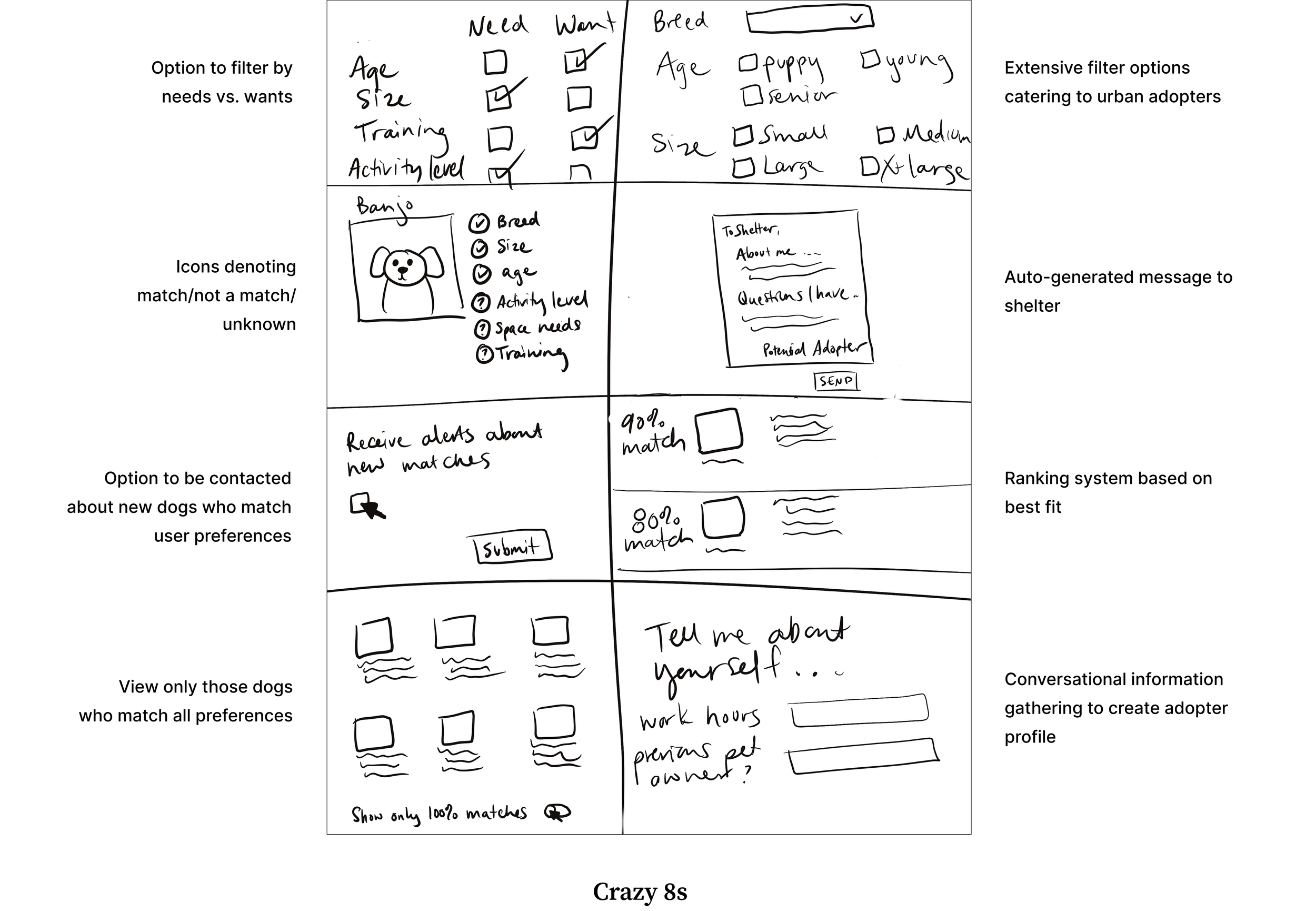From the user flow I mapped on Day 1, I identified the most critical screen as the moment when a user views a dog’s profile and realizes key compatibility information is missing. Since CityPups doesn’t control the data provided by shelters, I saw an opportunity to support users not by adding more filters, but by helping them recognize what isn’t there and guiding them toward a next step. I generated Crazy 8s sketches exploring ways to flag missing details and offer support.