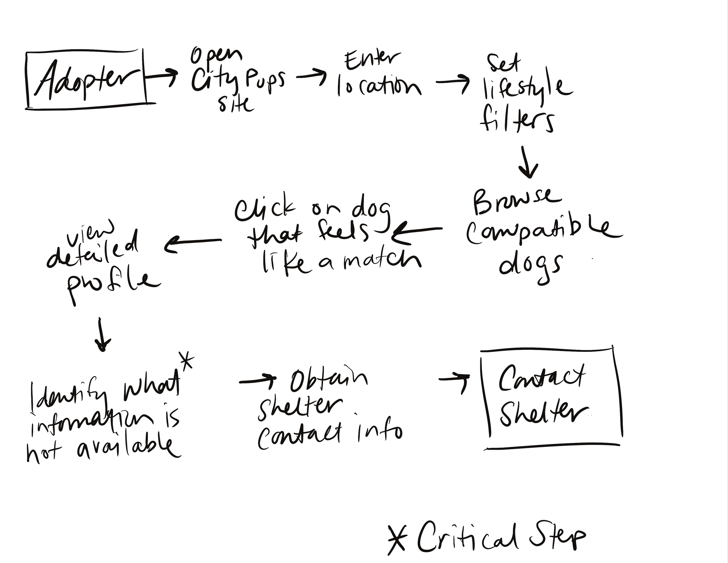 I reviewed the challenge brief, competitive landscape, and findings from early interviews. Many urban adopters reported frustration with vague dog profiles. They worried about size, temperament, training needs, and whether a dog could adapt to their lifestyle (e.g. small apartments, 9–5 workdays, busy streets. They also noted that it was difficult to find the right contact information for shelters and that repeatedly stating what they were looking for felt tedious. From this, I created a user map that tracked the adoption journey from opening the site to reaching out to a shelter.
