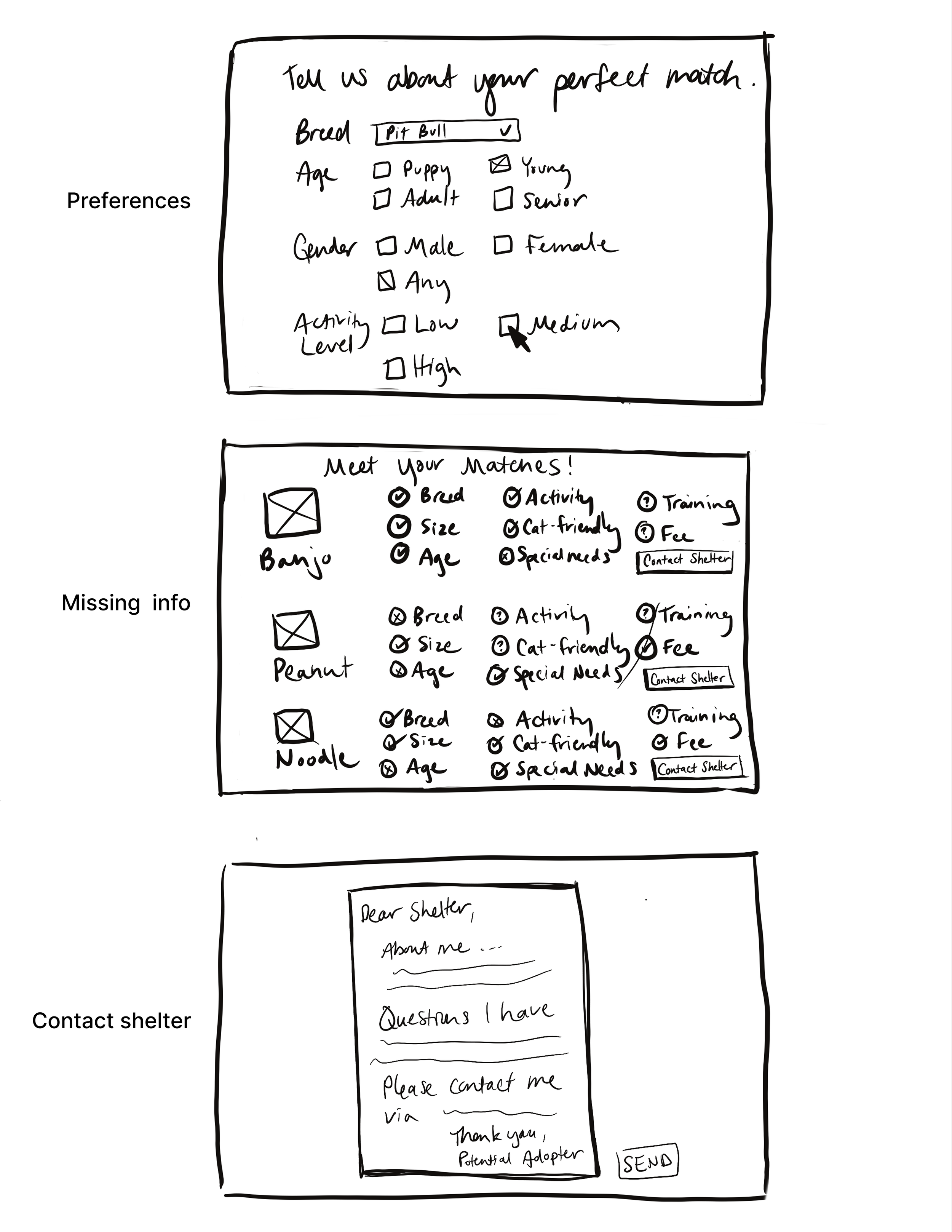 My final 3-panel solution sketch mapped a flow where users enter their preferences, view their matches with missing information clearly highlighted, and are prompted to contact the shelter using a pre-written message tailored to their concerns. This screen was designed to transform a frustrating moment of uncertainty into a supported action.
