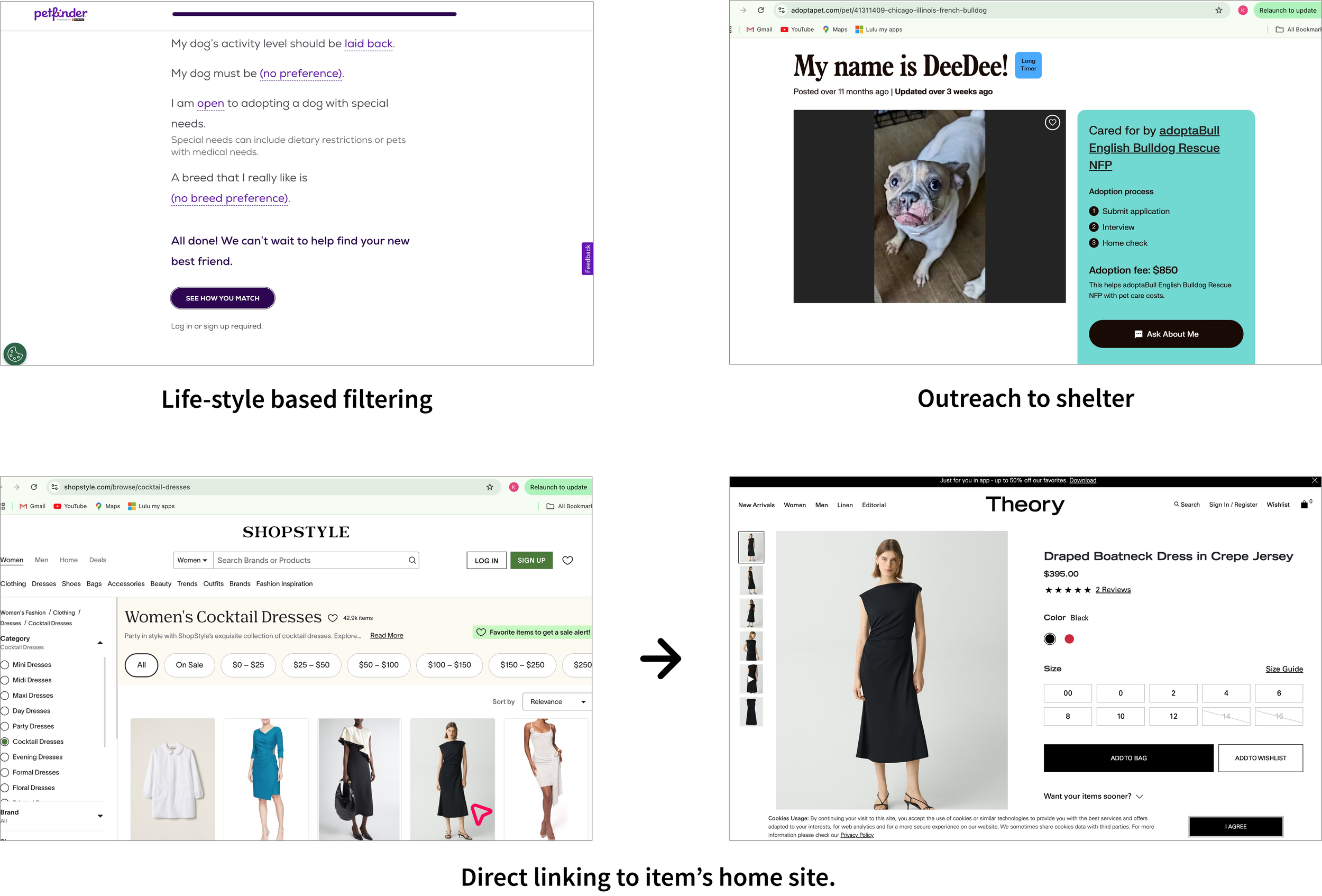 I began Day 2 by reviewing comparable experiences through lightning demos. From pet adoption platforms like Adoptapet.com and Petfinder.com, I noted features like lifestyle-based filtering, in-profile match assessments and the ability to send inquiries to shelters. I also drew inspiration from Shopstyle.com’s browsing flow, filtering flexibility and direct linking to the item’s home website.