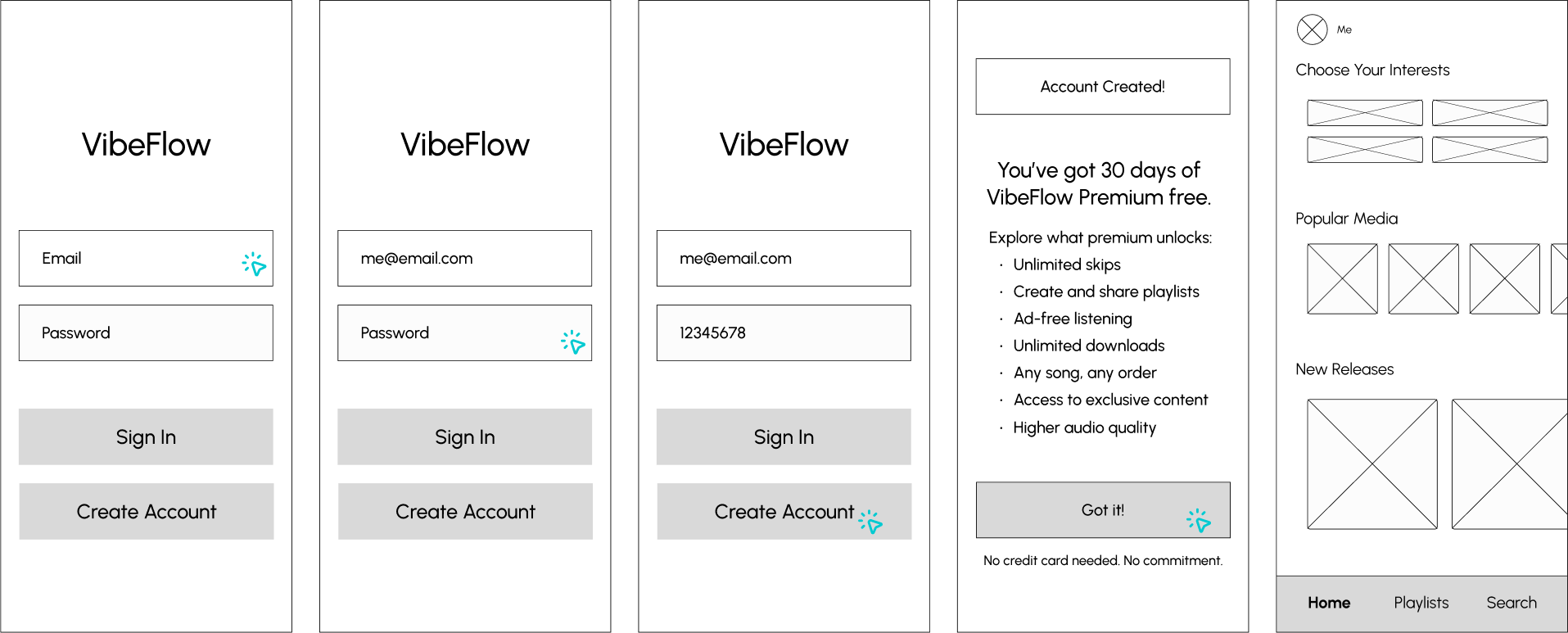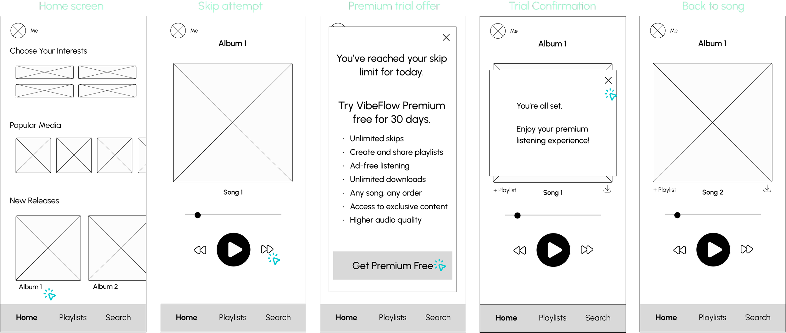 Additional flows (e.g., playlist creation, download attempt, profile upgrades) followed a similar structure, surfacing upgrade prompts at moments that highlight the value of the Premium experience.
