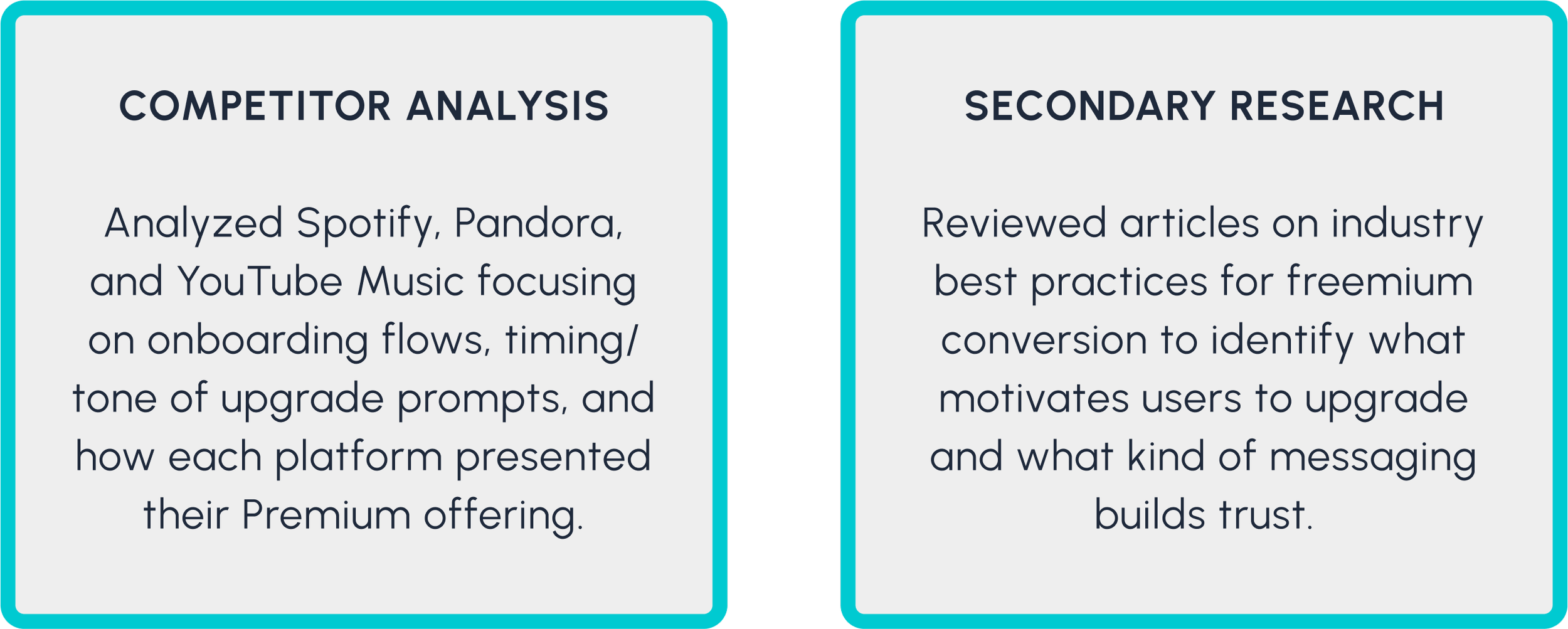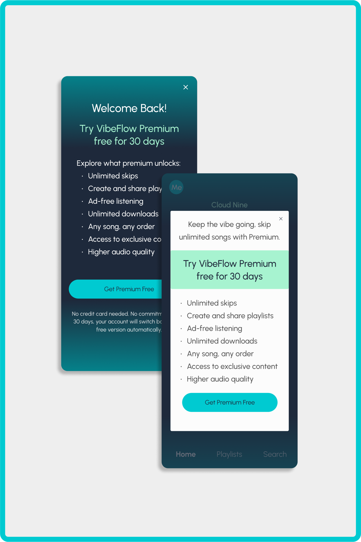 After completing the low-fidelity designs, I realized the upgrade prompts felt repetitive and could be easily dismissed. This led me to explore auto-enrolling users in a 30-day Premium trial to reduce friction and encourage deeper exploration of premium features. As a result, I shifted my original testing plan and decided to conduct a preference-based usability test comparing opt-in versus auto-enroll trial flows.