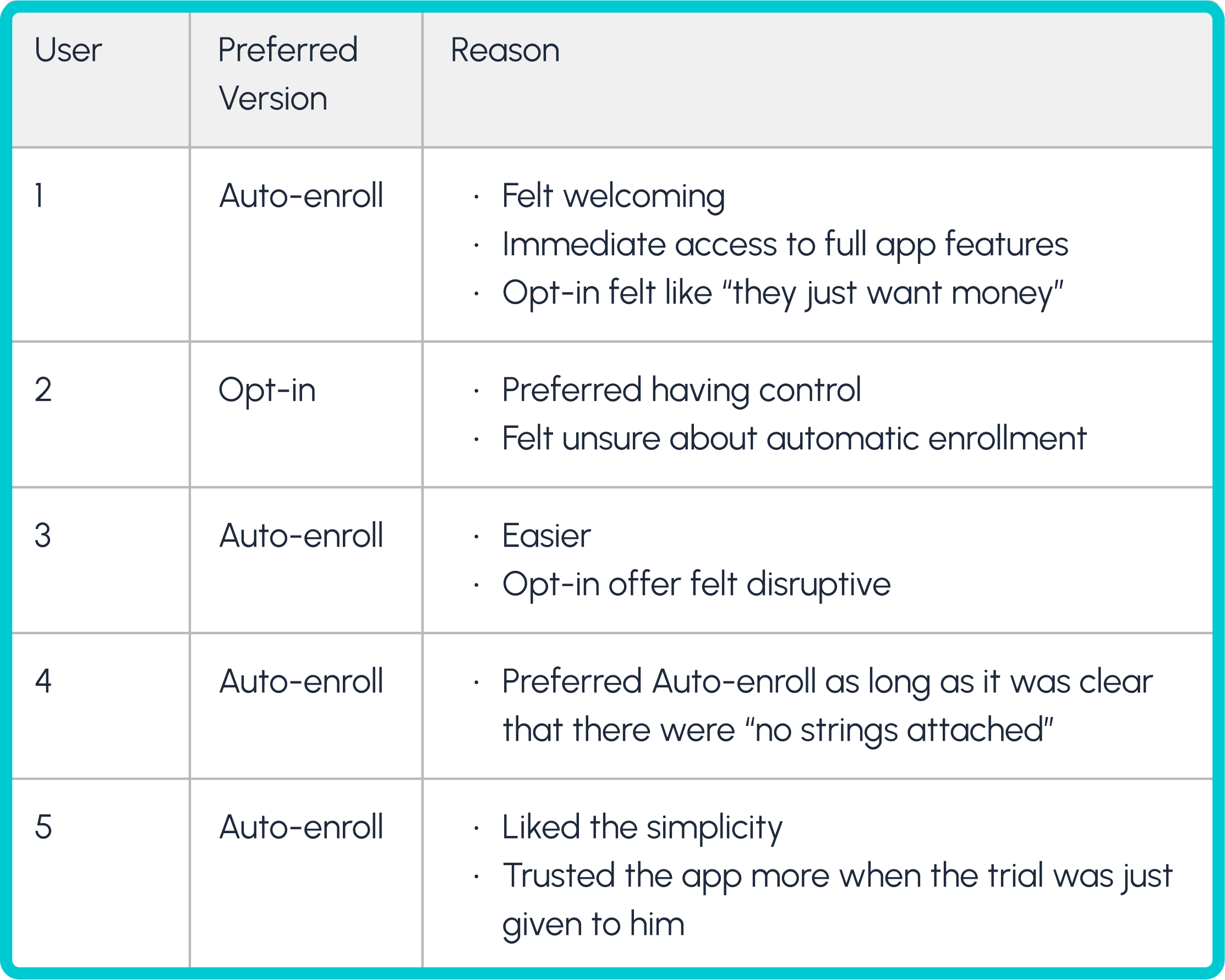 To explore how best to introduce a free Premium trial, I tested two onboarding flows: one that automatically enrolls users, and one that asks them to opt in.