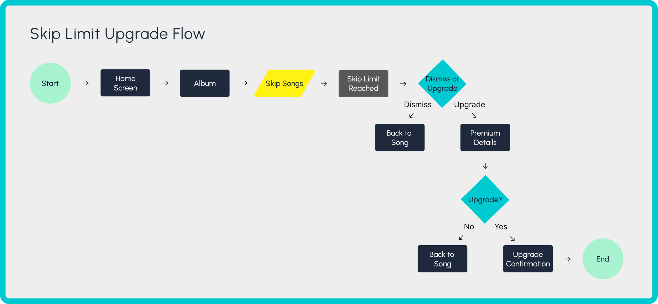 This flow places the upgrade prompt directly after a blocked action, aligning the offer with user intent and maintaining continuity in the listening experience.